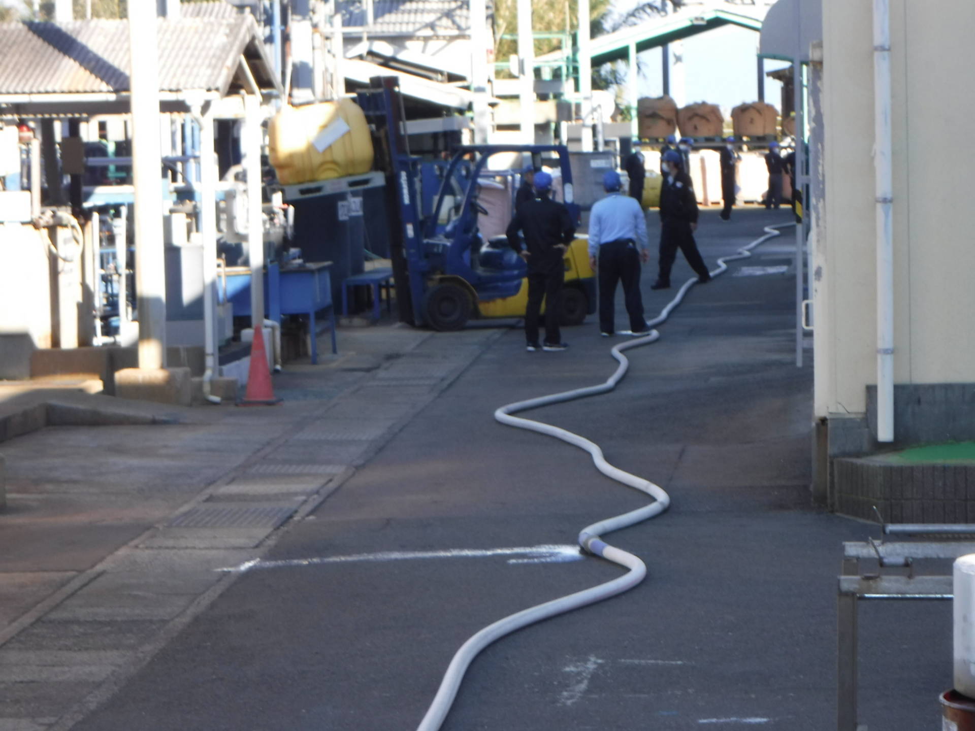 例年は会社駐車場へ避難しそこで初期消火訓練と放水訓練を行いますが、今年は本番さながらで会社駐車場は従業員の車を止めたまま、避難先は事前に許可をもらった会社入口の元キャンプ場駐車場にして実施しました。